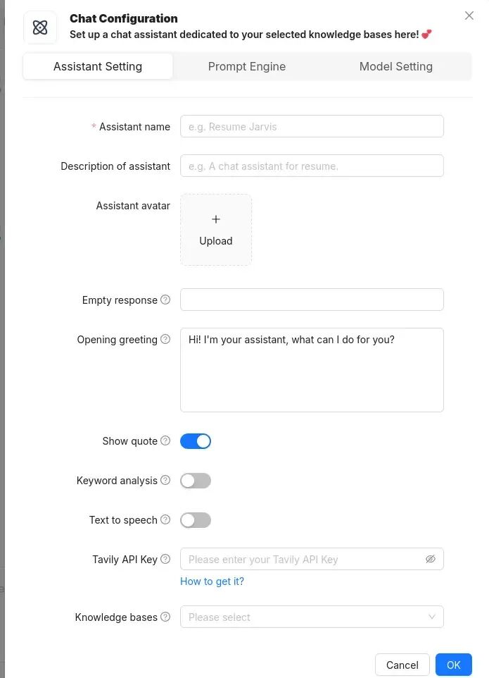 - 现在进入“chat”(聊天)部分,在那里创建一个助手,给它命名,并选择你创建的知识库。