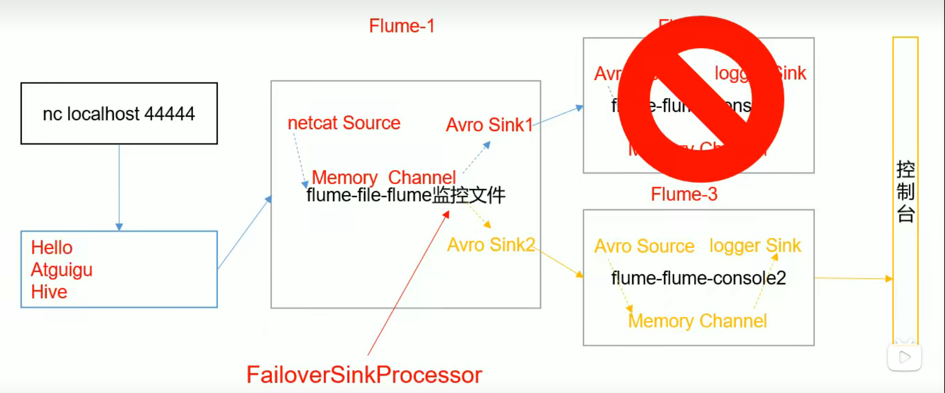 使用Flume1监控一个端口,其sink组中的sink分别对接Flume2和Flume3,采用FailoverSinkProcessor,实现故障转移功能