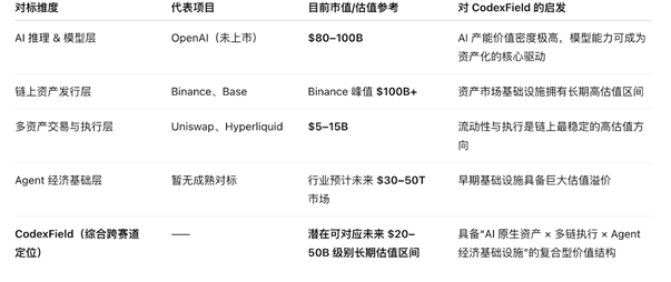 在这种背景下,CodexField 的估值逻辑也出现了跨越式扩展。它不再被归类为某一种传统产品类型,更多的其实是接近一种“复合型基础设施”,覆盖 AI 模型、资产发行、执行网络、交易系统与 Agent 经济的底层价值流动。因此行业对标也呈现出多维度组合结构,而不仅仅是单点对标。