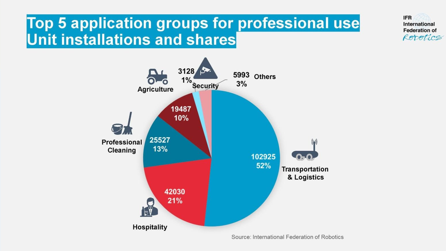 全球服务机器人核心应用领域安装量及市场占比,从高到低的排序:运输与物流52%,酒店服务21%,专业清洁13%,农业10%,其他3%,安保1%,图上所示数量为统计安装运行量。