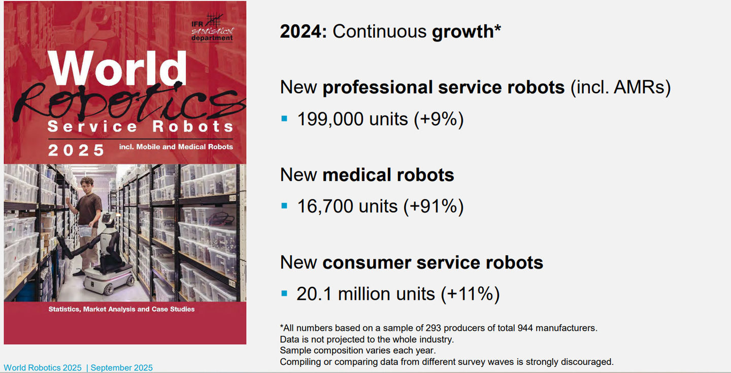 2024 年三类服务机器人的新增量及增长情况,新增专业服务机器人(含自主移动机器人 AMRs),增长9%,19.9万台;新增医疗机器人,增长91%,1.67万台;新增消费级服务机器人,新增消费级机器人,增长11%,2010万台。| 图源:IFR