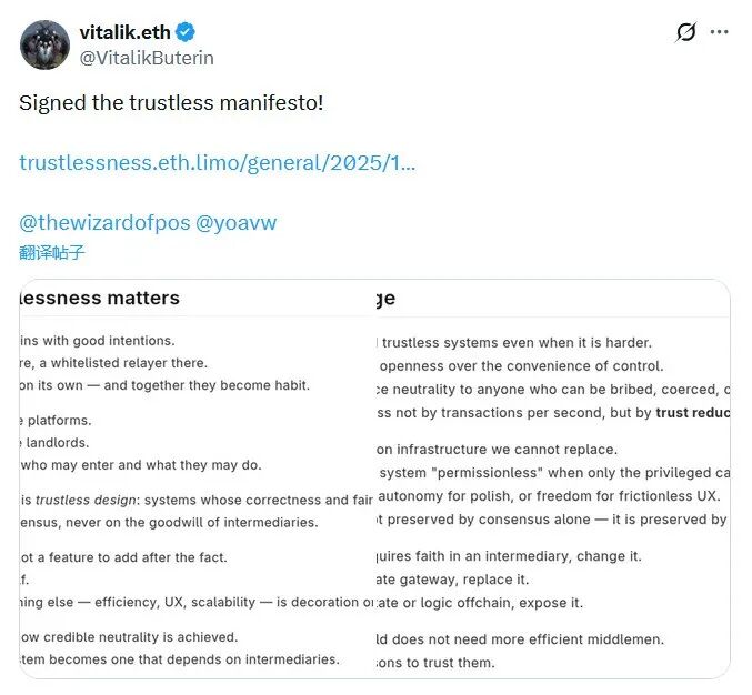 11月12日,以太坊联合创始人Vitalik Buterin在社交媒体宣布签署《无需信任宣言》(The Trustless Manifesto),这份由Yoav Weiss、Vitalik Buterin和Marissa Posner共同撰写的宣言,为区块链行业的"无需信任"特性提供了明确定义和设计准则。这份宣言不仅是技术哲学的阐述,更是对行业演进路线的系统性反思。