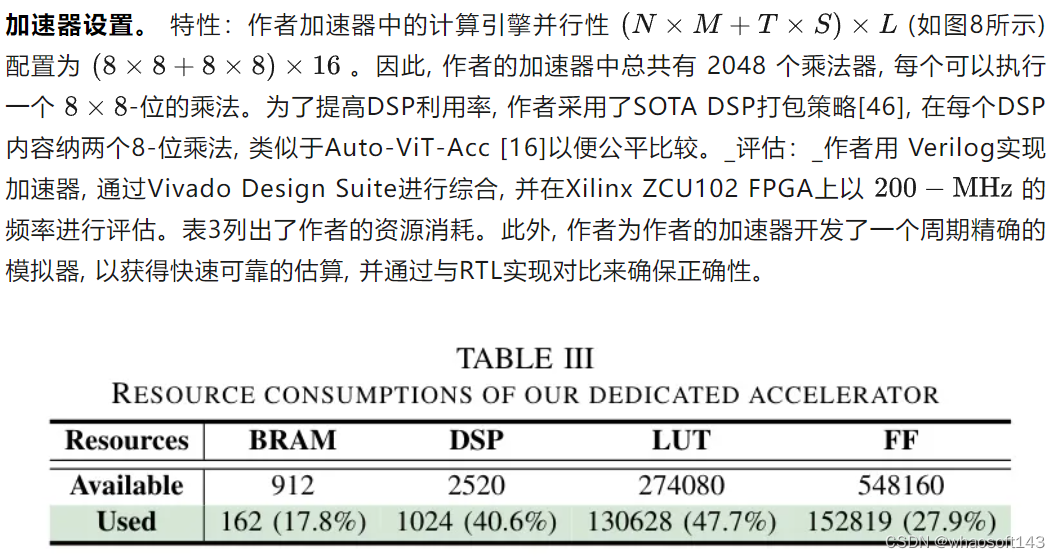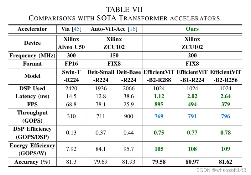 对于ViT加速器,VAQF 被设计用来加速具有二进制权重和混合精度激活的ViTs。Auto-ViT-Acc 结合了FPGA上可用的异构计算资源(即DSPs和LUTs)来分别为ViTs加速混合量化方案(即固定点和二进制)。