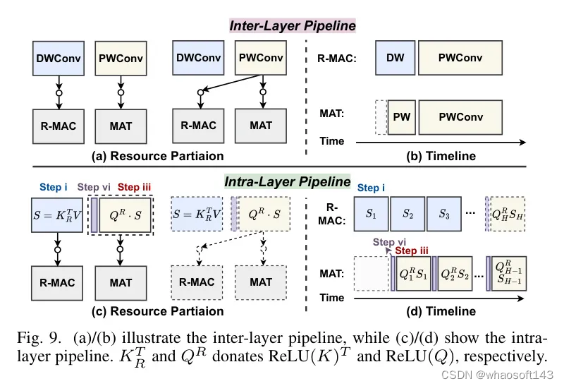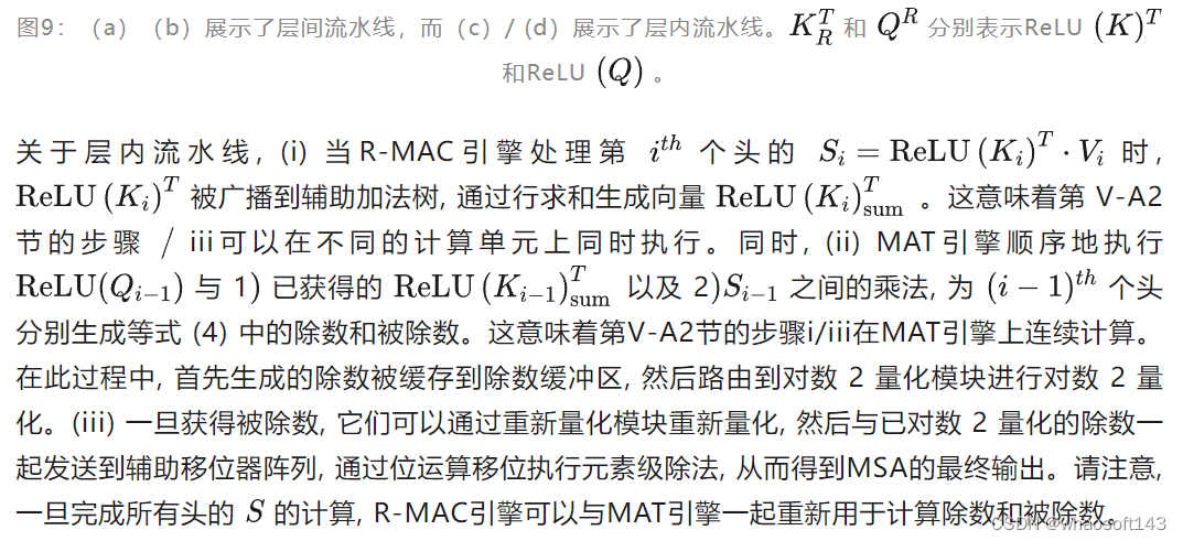 提供的机会:层内流水线。 考虑到作者的混合设计中MAT引擎、R-MAC引擎和低成本的辅助处理器,上述涉及各种操作类型的注意力计算步骤可以同时由不同的计算单元处理,从而提供了融合的机会。例如,(i) 当步骤i中的在MAT/R-MAT引擎上执行时,可以广播到辅助加法树以执行步骤ii中的行求和。此外,(ii) 当步骤iii和iv被处理时,它们的输出可以立即发送到移位器阵列进行逐元素除法。