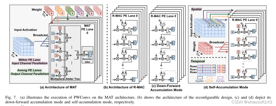 设计选择 2:可重构架构。 为了解决上述限制,作者可以考虑图7(b)中所示的可重构架构,该架构包含了多个可重构的乘积累加单元(R-MACs)。(i) 如图7(c)所示,在执行通用卷积、PWConvs和MatMuls时,此架构可以配置为在向下前向累加模式下运行,以实现与MAT架构相同的功能。这意味着每个PE通道支持输入通道并行以实现psum重用,而不同的PE通道则倾向于输出通道并行以利用输入重用的机会。(ii) 如图7(d)所示,在执行DWConvs时,R-MAC可以被配置为在自累加模式下运行,因此每个滑动窗口内的部分和可以在每个R-MAC中_时间上_积累,这使得这种设计固有地支持各种核大小的DWConvs。特别是,每个PE通道内的R-MAC可以_空间上_计算来自不同输出通道的多个输出像素以提高吞吐量,因此这里的并行性是沿着 输出通道(见图7(d)右)。