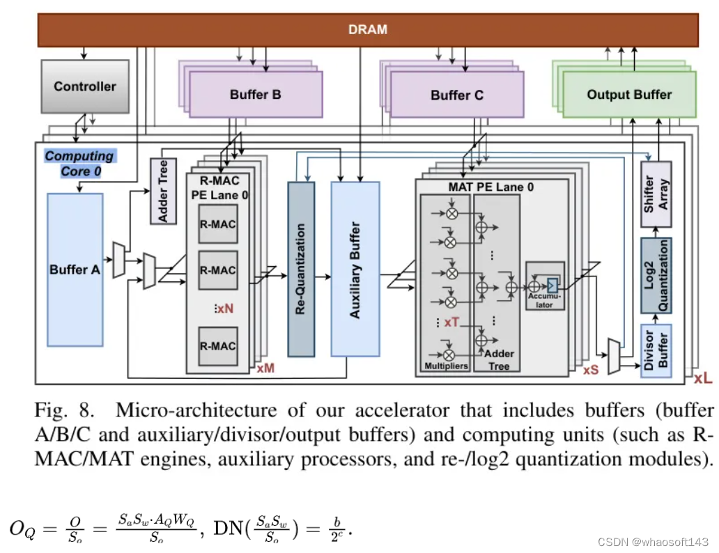至于内部缓冲区,缓冲区A将数据广播到R-MAC引擎中的所有PE通道,也可以将数据发送到辅助加法树。辅助缓冲区缓存R-MAC引擎的输出,并将数据广播到MAT引擎中的所有PE通道,作为两个引擎之间的桥梁。除数缓冲区存储等式(4)中的除数,然后将其传输到log2量化模块,为随后的位运算移位做准备。