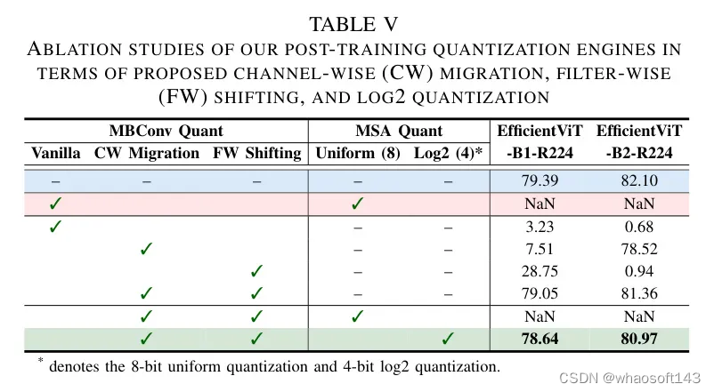 (ii) 通过结合作者提出的通道迁移和滤波器偏移,分别解决上述两个问题,两者都是不可或缺的,作者可以有效地量化MBConvs,平均准确度仅下降0.54%。在此基础上,关于轻量级MSA的量化,