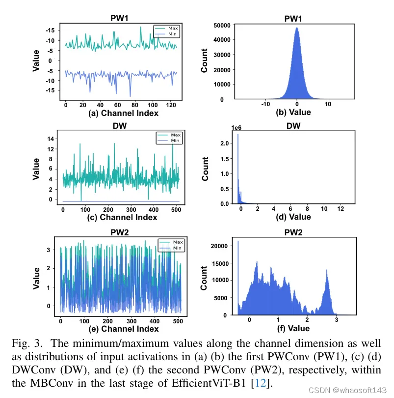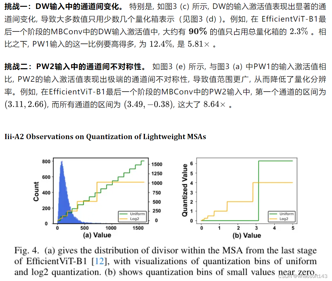 (i) 由于DW输入中的通道间变化和PW2输入中的通道间不对称,如第IV-A1节所述,普通的均匀量化无法量化EfficientViT中的MBConvs。