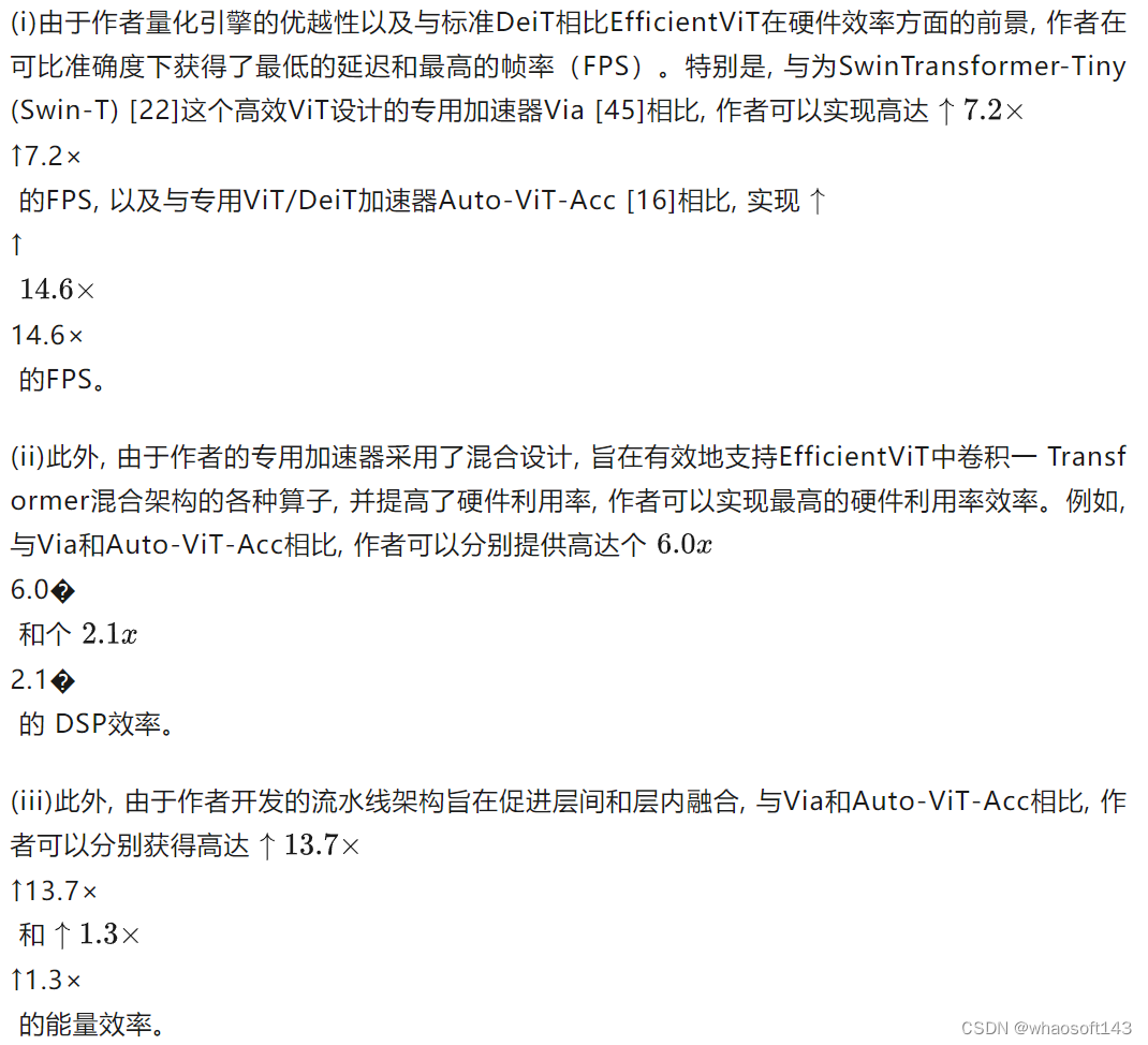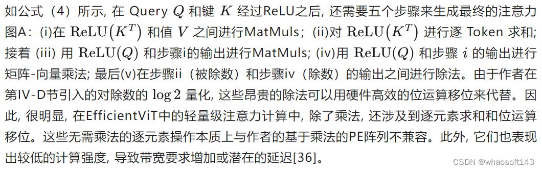 另外,Flatten Transformer(扁平 Transformer )选择了一种创新的聚焦线性注意力,保持了低计算复杂性的同时保留了表达性。尽管在高效ViTs中的无需Softmax的线性注意力具有固有的算法优势,包括(i)无需Softmax的性质便于量化,(ii)线性复杂度提升硬件效率,但它们专门的量化和加速方法仍然探索不足。