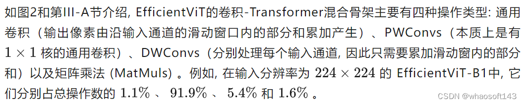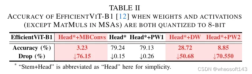 (ii) 为了解决这一限制,提出了名为EfficientViT [12]的SOTA高效ViT,其特点是无需Softmax的线性注意力(LinAttn),并且可以用更少的参数和计算成本实现更高的准确度。这凸显了EfficientViT的优势,强调了量化以促进其实际应用的需求。