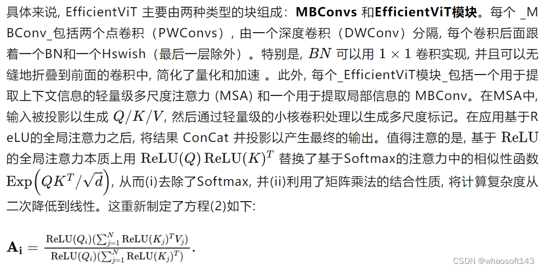 特别是,EfficientViT(高效视觉 Transformer ),作为当前最先进的方法,用一种新颖的轻量级多尺度注意力替换了复杂度为平方的普通自注意力,实现了全局感受野的同时提升了硬件效率。
