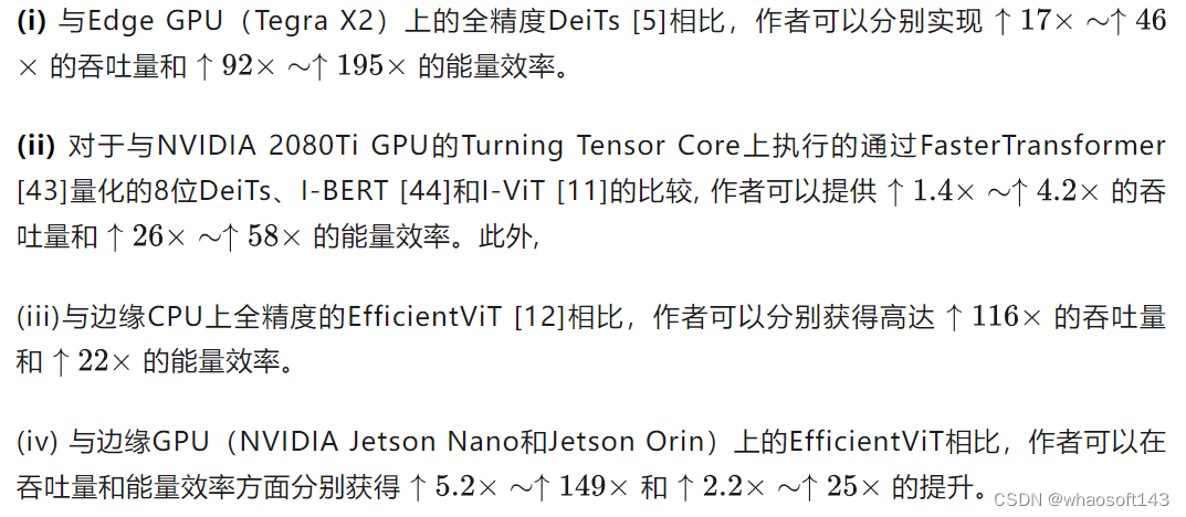(iv) I-ViT ,并在支持通过TVM高效整数运算的GPU(NVIDIA 2080Ti)的Turing Tensor Core上进行加速;(v)在广泛使用的边缘CPU(高通骁龙8Gen1 CPU)和边缘GPU上执行全精度EfficientViT,