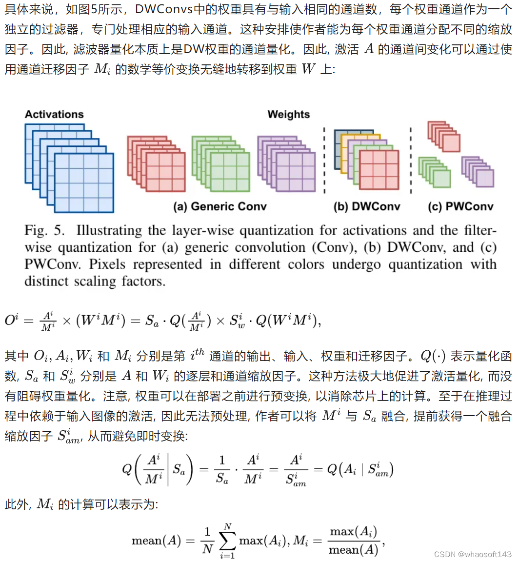正如在第IV-A1节挑战#2中介绍的,DW的输入存在极大的通道间变化,使得传统的逐层量化方法不适用。幸运的是,由于DWConvs独特的算法特性,它们独立处理每个输入通道,从而消除了通道间的求和,作者可以直接采用通道量化为每个输入通道分配单独的缩放因子。这种方法有效地解决了上述挑战,同时没有牺牲硬件效率。然而,尽管它在提高量化精度方面具有潜在优势,但它显著增加了缩放因子的数量,这对于通过LSQ [32]进行优化构成了另一个挑战,LSQ是在逐层量化激活中广泛采用的优化缩放因子的方法。