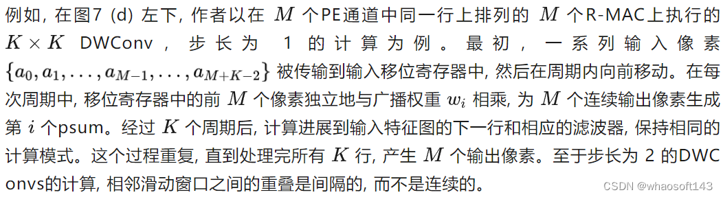 此外,权重可以广播到所有PE通道,并与来自不同滑动窗口的输入像素相乘,以生成同一输出通道的连续输出像素(见图7(d)左上)。通过这样做,作者只需要几个辅助寄存器就可以重用相邻滑动窗口之间的重叠,并且轻松支持具有不同步长的DWConvs。