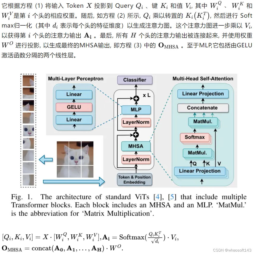 如图1所示,输入图像最初被划分为固定大小的块,并通过 Token 和位置嵌入进一步增强,作为ViTs Transformer 块的输入 Token 。