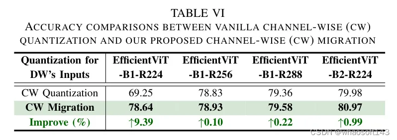 提出的通道迁移的有效性。 考虑到DWConvs的独特算法特性,其中每个权重通道作为一个独立的滤波器处理每个输入通道,通道量化是解决DW输入中通道间变化的直接解决方案,如第IV-B节所述。然而,这将大大增加缩放因子的数量,通过LSQ [32]进行量化优化挑战性增加,限制了可实现的准确性。因此,作者建议在层量化之上采用通道迁移。如表6所示,通过这样做,作者可以提供平均2.67的准确度,证明了在保持优化效率的同时解决DW输入的通道间变化的优势。