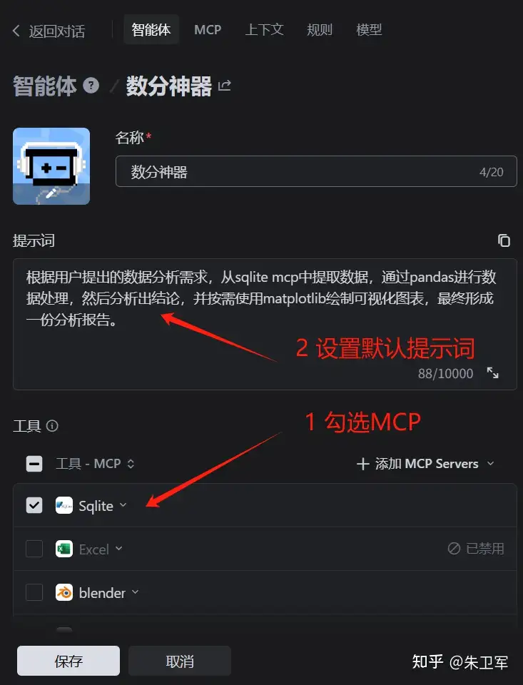 这里要注意两点,首先“数分神器“智能体需勾选SQLite MCP服务,其次要设置默认提示词,告诉智能体它的角色和任务。