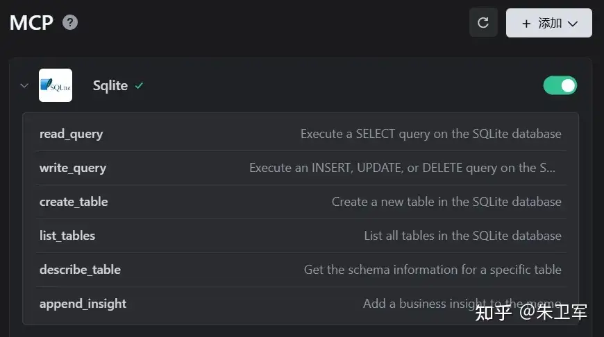 最后还要用到SQLite MCP,这是一个专门用于操作本地SQLite数据库的MCP服务,所谓MCP服务即“模型上下文协议”,是大模型与外部工具的连接标准,就像电脑之于USB一样。SQLite MCP能支持AI自动查询、读取、操作数据库,完全不需要手工干预。