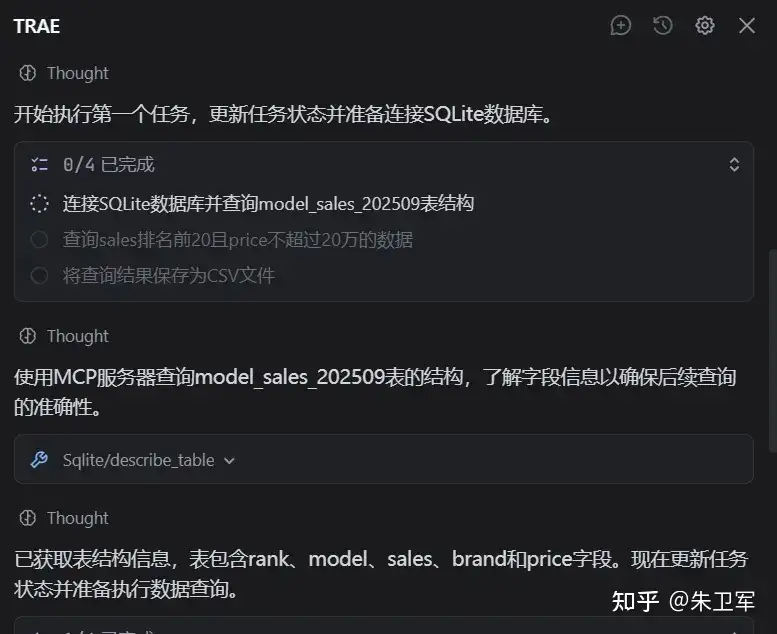 智能体会尝试连接SQLite数据库,并查询相关表结构,按照要求抽取数据。