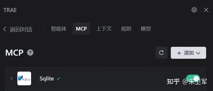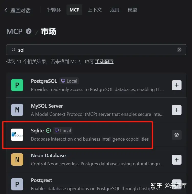 SQLite MCP就是现成的,能直接从集市里添加,然后在配置信息里输入前面的my_db.db数据库路径地址,保存即可。