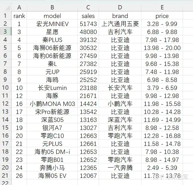 接下来咱们列举几个常见的数据库处理场景,以某月份车型销量数据为例,该数据已经提前存储在SQLite数据库中。