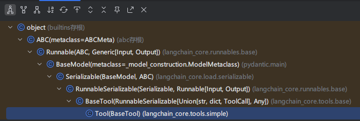 分析LangChain源码可知,在 LangChain 的类结构中,tool 的顶层基类是 Runnable,定义可执行的对象,实现了通用的执行接口。然后又通过 Serializable 提供 LangChain内部的可序列化能力,从而实现了允许工具、链、模型被保存或导出,供后续加载。最后通过 BaseTool 定义工具的统一规范 ,实现了同步 / 异步支持,参数校验等功能。