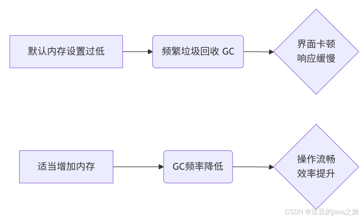 - 内存不足的后果:当可用内存不足时,JVM(IDEA是基于Java开发的)会频繁进行垃圾回收(Garbage Collection, GC)。GC过程会暂停其他工作,反映到界面上就是卡顿、无响应。