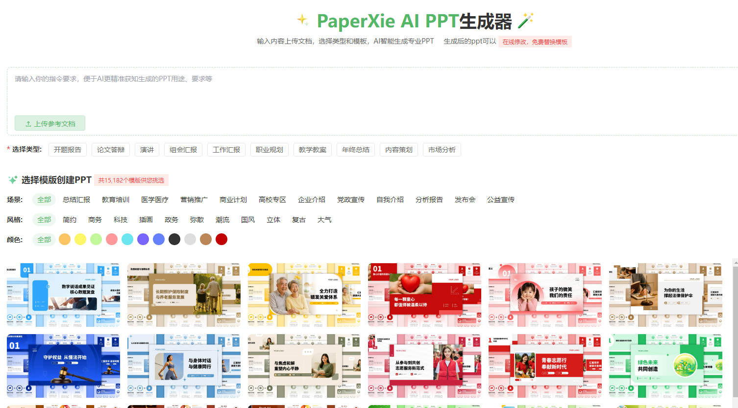 针对此问题,部分学术辅助平台引入了基于场景模板的自动化转译功能。本文依据 PaperXie 平台官网对其AI PPT模块的功能逻辑、操作流程及技术边界进行客观解析,旨在厘清其在“内容—演示”转换链中的辅助角色。
