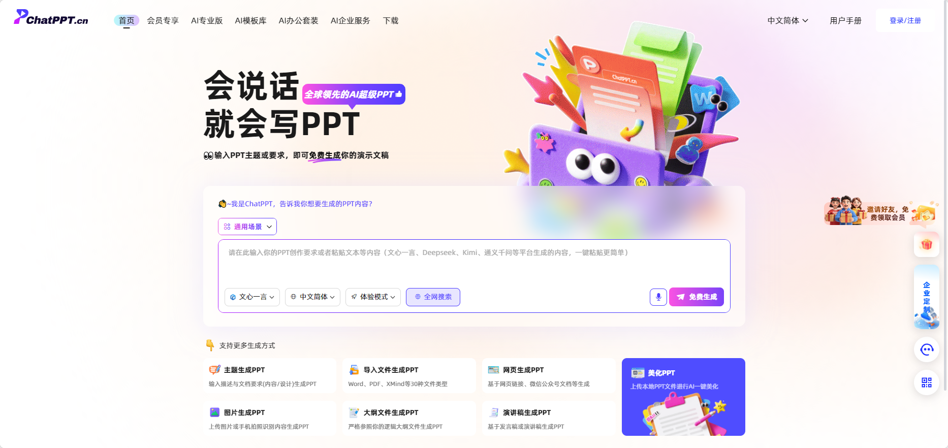适用场景:日常工作汇报、项目方案展示、教学课件制作——ChatPPT能帮你节省80%以上的PPT制作时间。