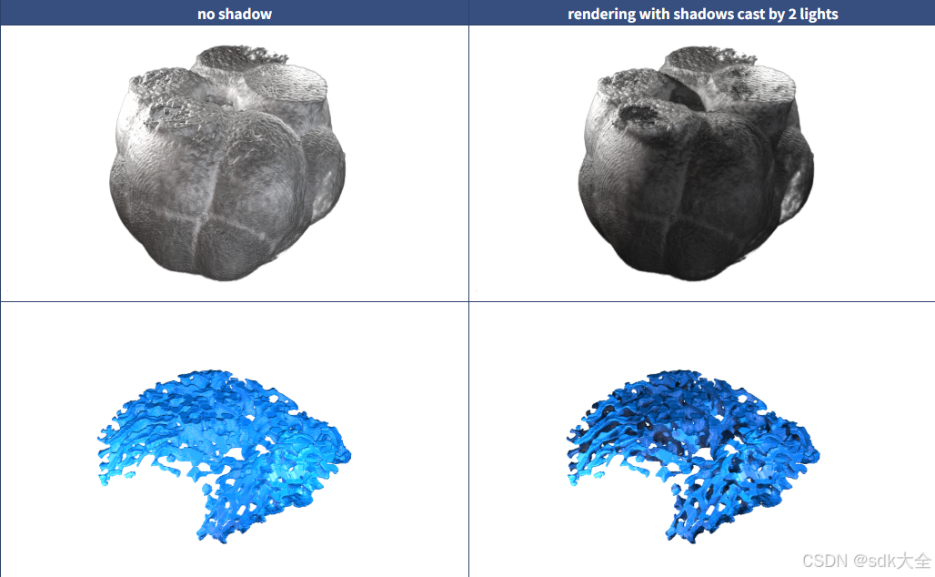 The following images higlight the benefit of shadows (see on the right) on some details of cells (top) and trabecular bones (bottom):