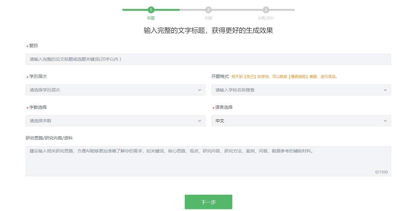 - 研究思路补充:支持输入“研究思路、核心观点、研究方法”等关键信息,作为AI理解研究方向的语义锚点;
