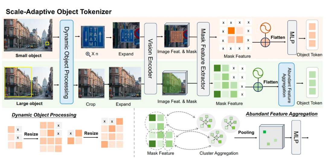 Scale-Adaptive Object Tokenizer(SAOT)。该像素级物体编码器能自适应地调整不同大小目标的特征尺度,让微小物体不被忽略、巨大目标不冗余;同时引入掩膜特征聚合(Abundant Feature Aggregation)与相对位置编码,让目标区域的表征既紧凑又富含上下文信息。