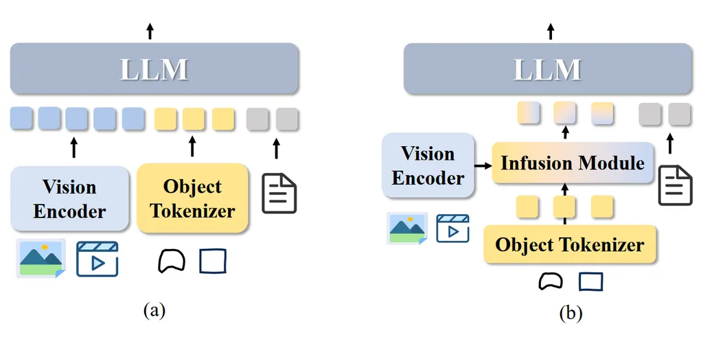 构建 Vision-Object Framework与Object-only Framework。其中对于 Vision-Object Framework,把全局视觉 token + 像素级区域 token + 文本 token 一起送入 LLM,既保留场景语境,又在对象级上精细推理。对于 Object-only Framework,将全局特征在前处理阶段融合入对象 token 表示中。这样一来,LLM 无需再使用全局视觉标记,显著降低显存与时间消耗,同时保持语义一致性与理解精度。