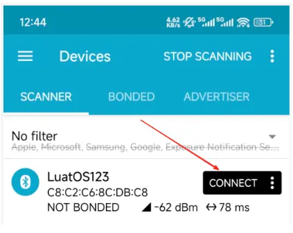 1、烧录示例 demo 到 Air8000 核心板后,手机端打开 nrf connect 蓝牙调试软件,找到广播的设备名称为"LuatOS123"的设备并连接。