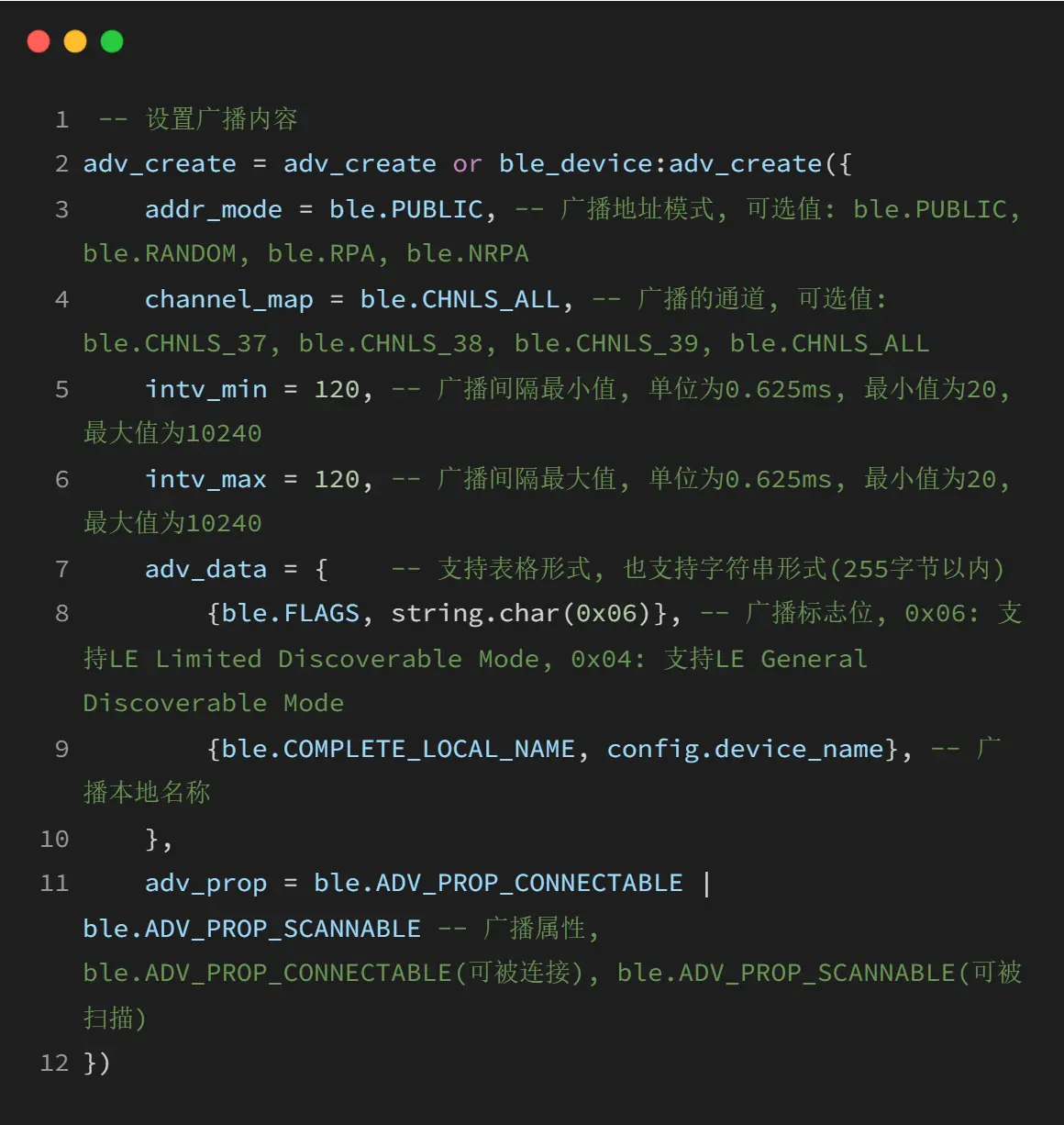 3、调用 ble_init(),初始化蓝牙功能,设置广播包内容并开始广播。