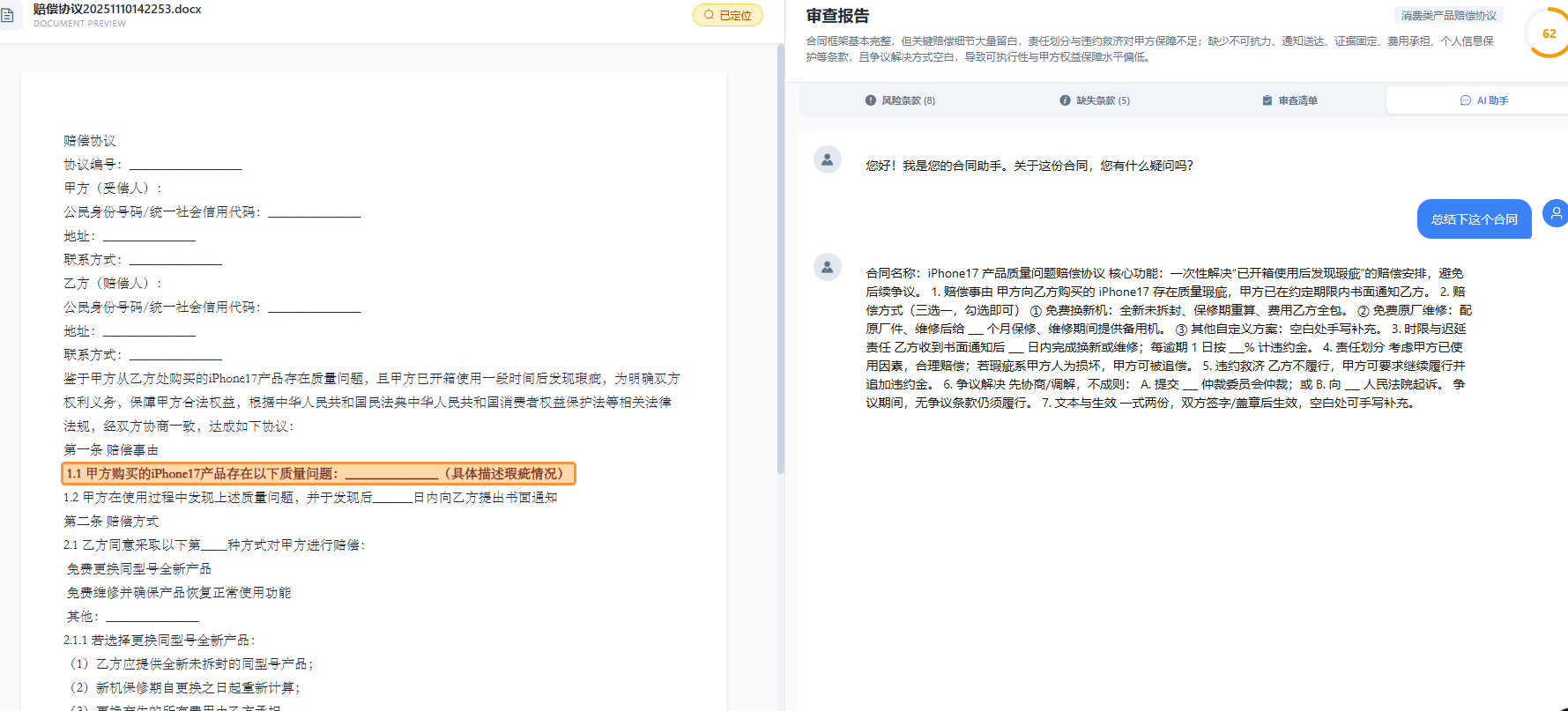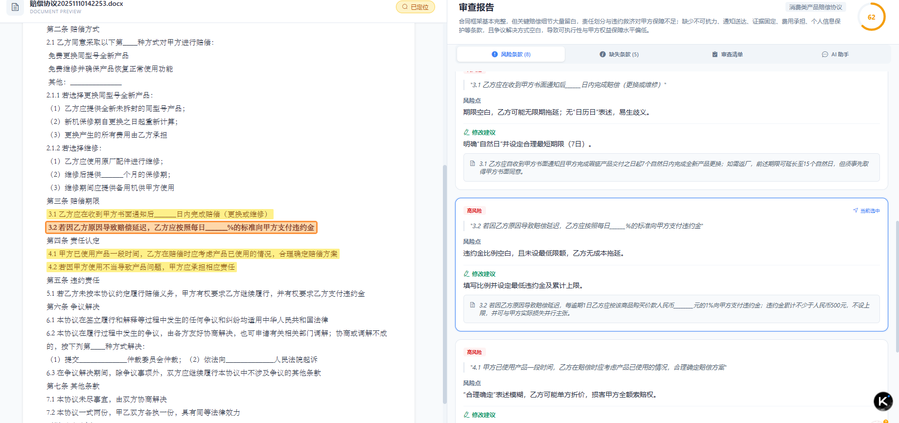 - 自动关联相关法律条文,生成”风险-法条-建议”三元组解释链