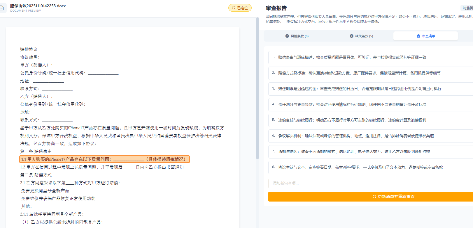 工程亮点:清单生成服务采用事件驱动架构,当用户手动调整清单时,触发ReviewStrategyUpdate事件,自动调整后续审查策略,实现人机协同的”动态博弈“。
