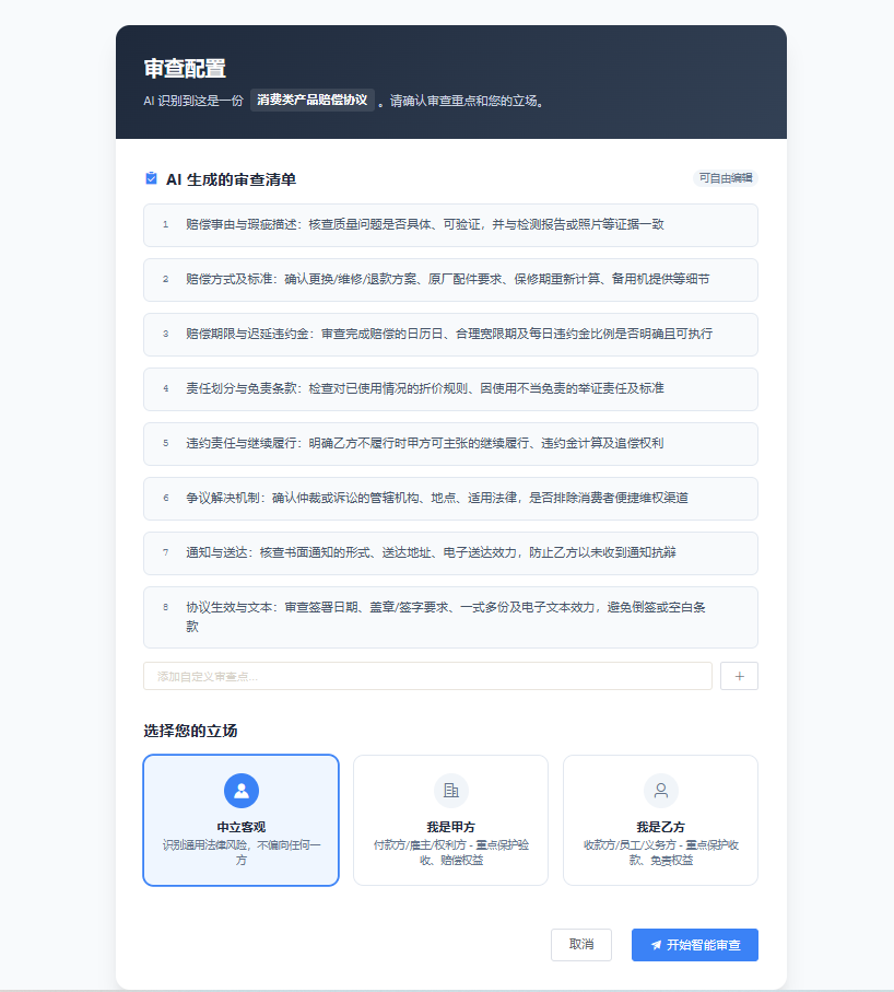 - 清单生成层:采用Chain-of-Thought prompting策略,让LLM生成带优先级权重的审查清单,支持风险等级(高/中/低)、法律依据、审查立场(偏向甲方/乙方/中立)三重维度标注