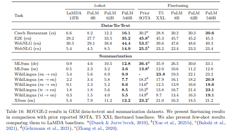 - 微调后,PaLM 540B 在 4/6 个英语摘要任务中实现 SOTA,证明规模可弥补解码器 - only 架构的固有劣势