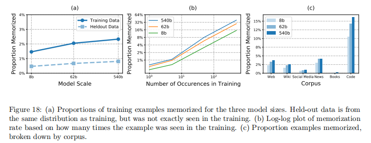 - 模型规模越大,记忆能力越强:8B 模型记忆率 1.6%,540B 模型达 2.4%