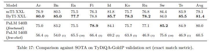 - 微调后 PaLM 540B 平均 EM 得分为 80.0,超越 mT5 XXL(79.1),接近 ByT5 XXL(81.4)