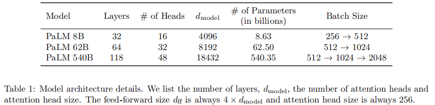 - 动态批次大小:随训练进度增大批次(540B 模型:512→1024→2048),平衡早期样本效率与后期训练效率
