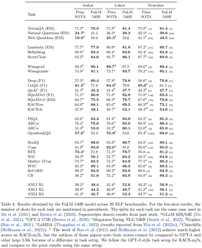 在 29 个常用英语 NLP 基准测试中,PaLM 540B 表现惊艳: