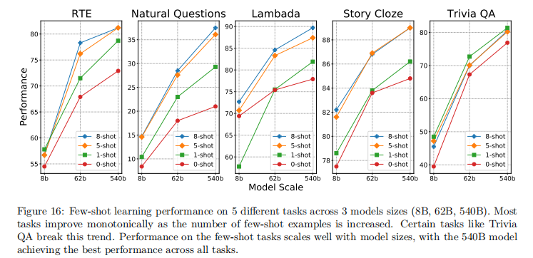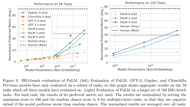 - PaLM 540B 5 样本设置下,平均得分超过人类平均水平,在 58 个共同任务中 44 个超越现有 SOTA
