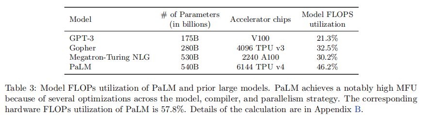 论文提出模型 FLOPs 利用率(MFU) 指标,相比传统硬件 FLOPs 利用率(HFU)更具可比性,定义为实际 token 吞吐量与理论最大吞吐量的比值(仅计算前向 + 反向必需操作,不包含重计算)。PaLM 540B 的 MFU 达到 46.2%(含自注意力),硬件 FLOPs 利用率为 57.8%,显著优于同类大模型: