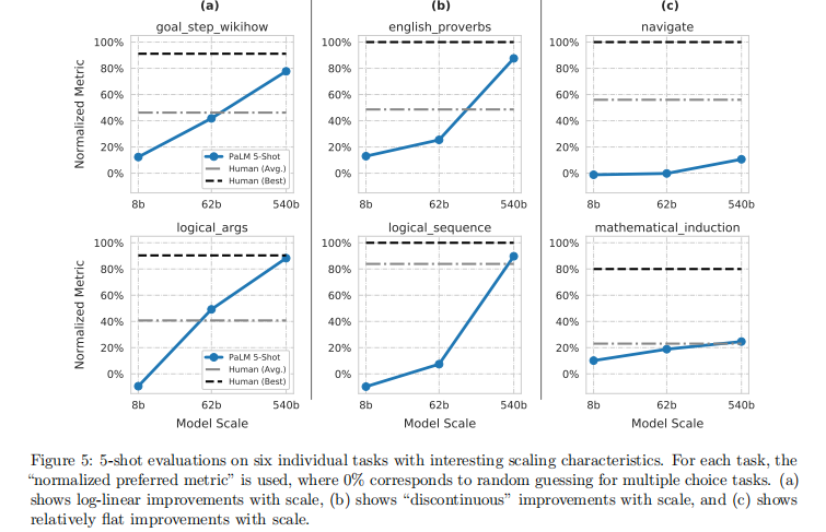 - 约 25% 的任务呈现不连续提升:从 62B 扩展到 540B 的性能提升远大于 8B 到 62B 的提升(如英语谚语任务:62B 准确率 25%,540B 达 87%)