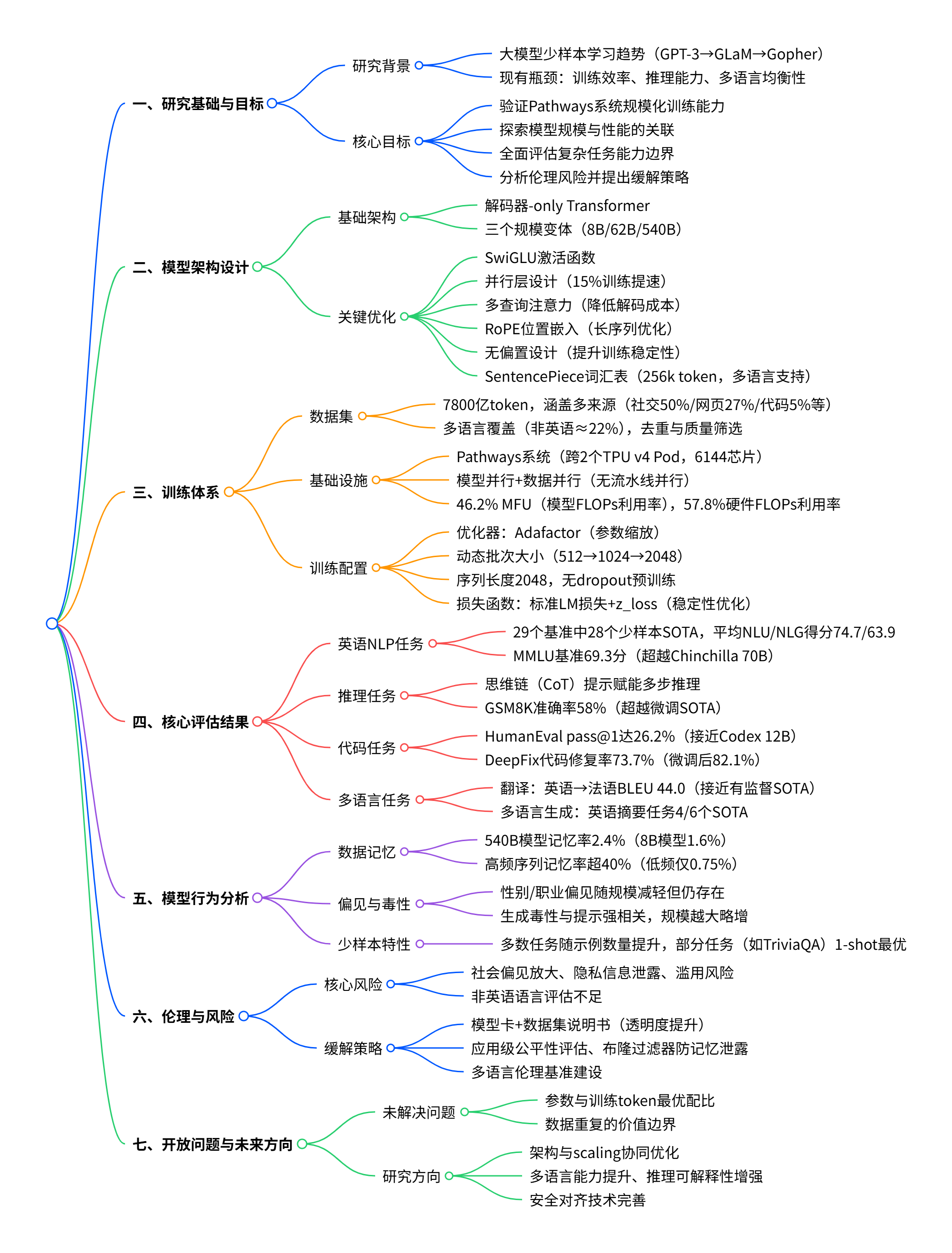 PaLM 作为 5400 亿参数的大规模语言模型,通过 Pathways 系统实现了高效训练,其全面的评估结果与深入的行为分析为大模型研究提供了宝贵启示: