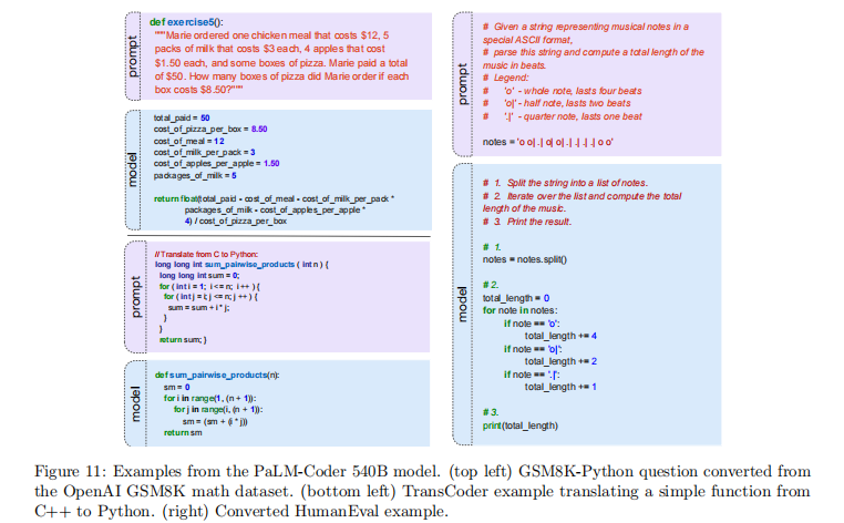 PaLM 在代码生成、翻译、修复等任务中表现优异,甚至超越专用代码模型:
