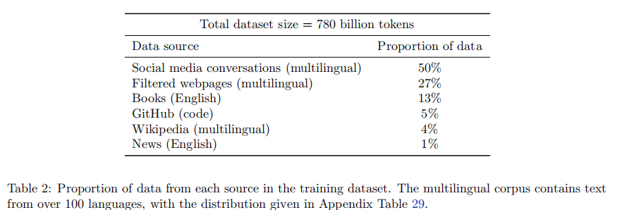 PaLM 基于 7800 亿 token 的高质量语料训练,涵盖多种数据源,确保语料多样性与质量: