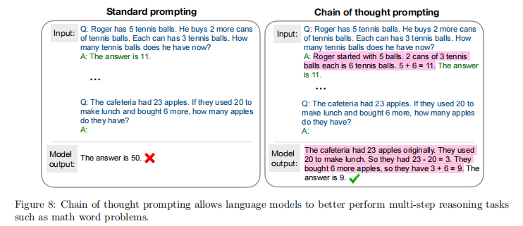 推理任务(尤其是多步数学和常识推理)是大模型的传统弱项,PaLM 通过思维链(Chain-of-Thought, CoT)提示实现突破: